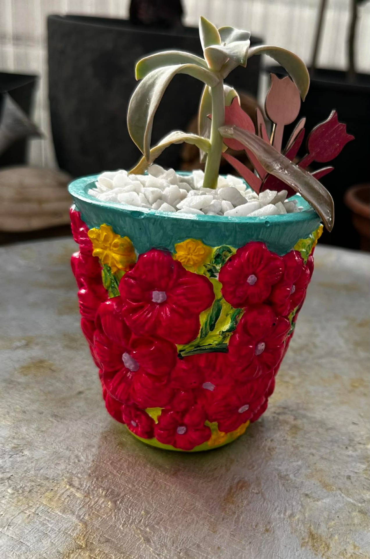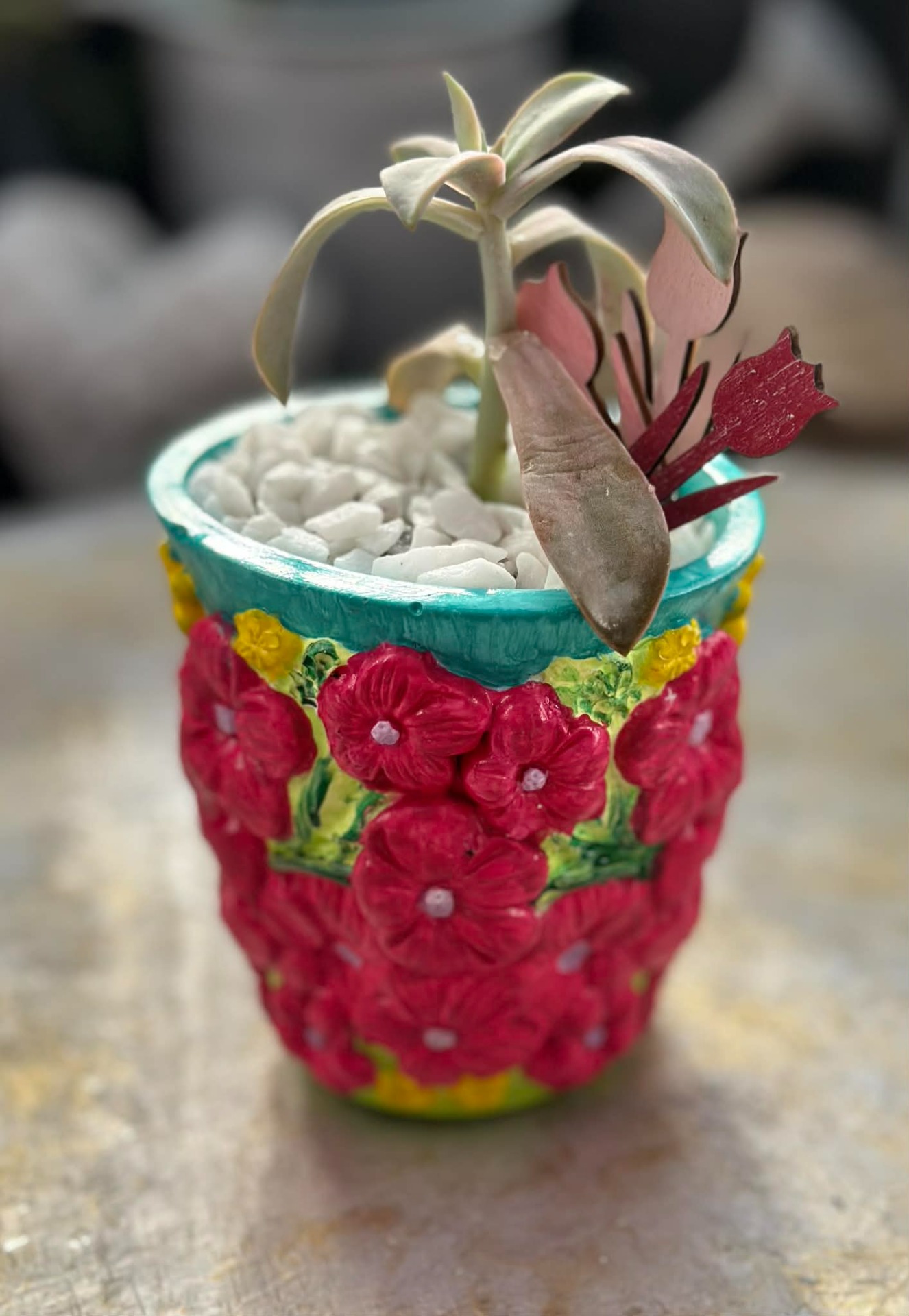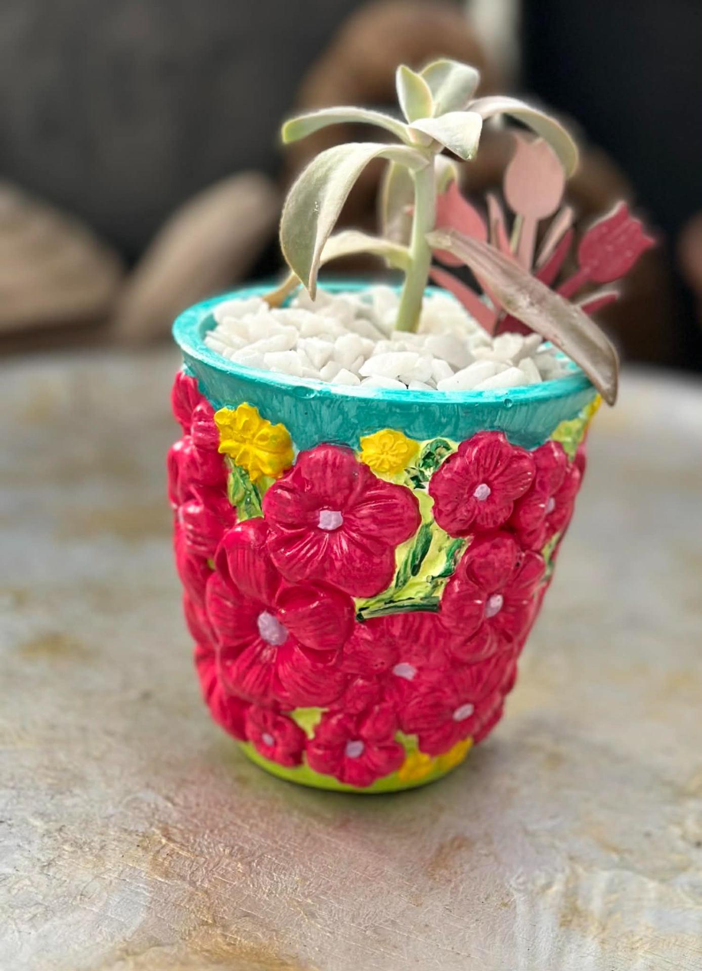 Vidám, élénk rózsaszín virágokkal díszített, egyedi kézműves kaspó, amely garantáltan feldobja az otthon hangulatát. A részletgazdag, kézzel festett minták és a friss, tavaszi színek igazi örömforrássá teszik.