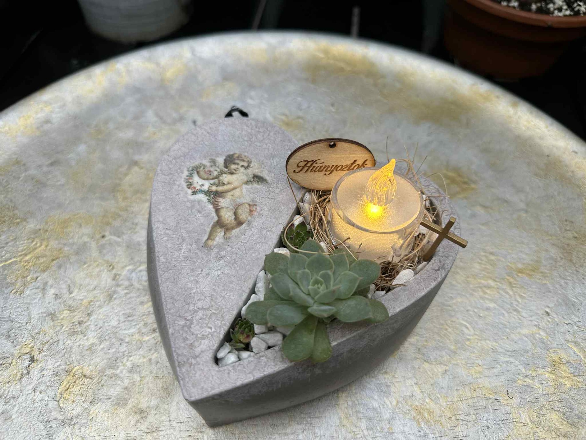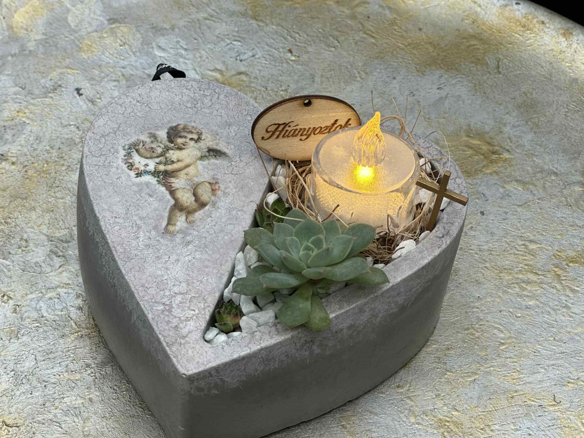 Szív alakú, angyalkás kaspó, elő pozsgásokkal, világítással, szürke, fehér, 2 - RENDELHETŐ