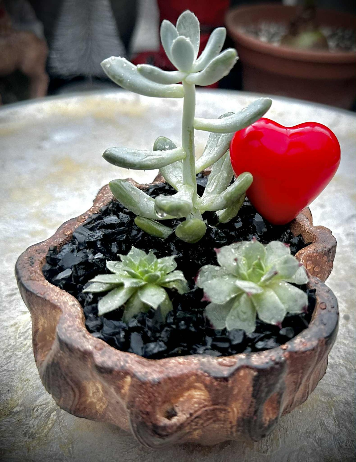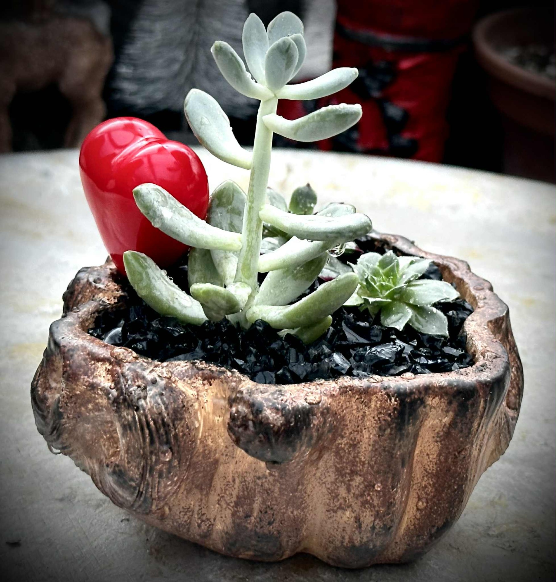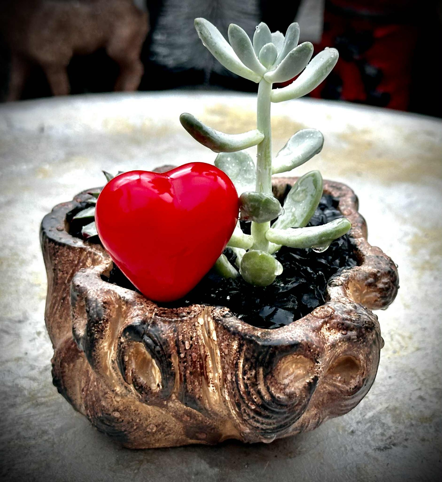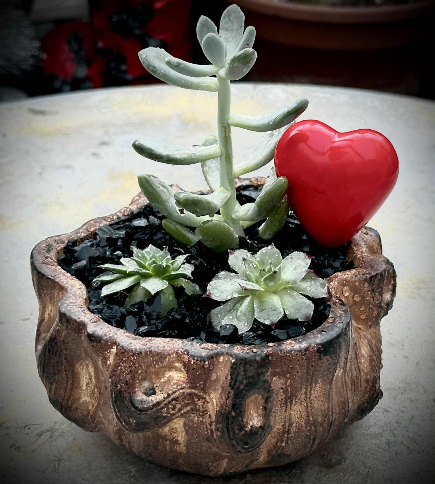 Elegáns, fagyálló, kézzel festett és összeültetett pozsgás kompozíció, különleges, farönk hatású kaspóban, finom szív díszítéssel. A harmonikus növényelrendezés és a természetes textúrák időtálló, prémium megjelenést kölcsönöznek, így tökéletes választás exkluzív ajándéknak vagy stílusos otthoni dekorációnak. A pozsgások könnyen gondozhatók, mégis látványos, hosszú távon is szép összeültetést alkotnak.