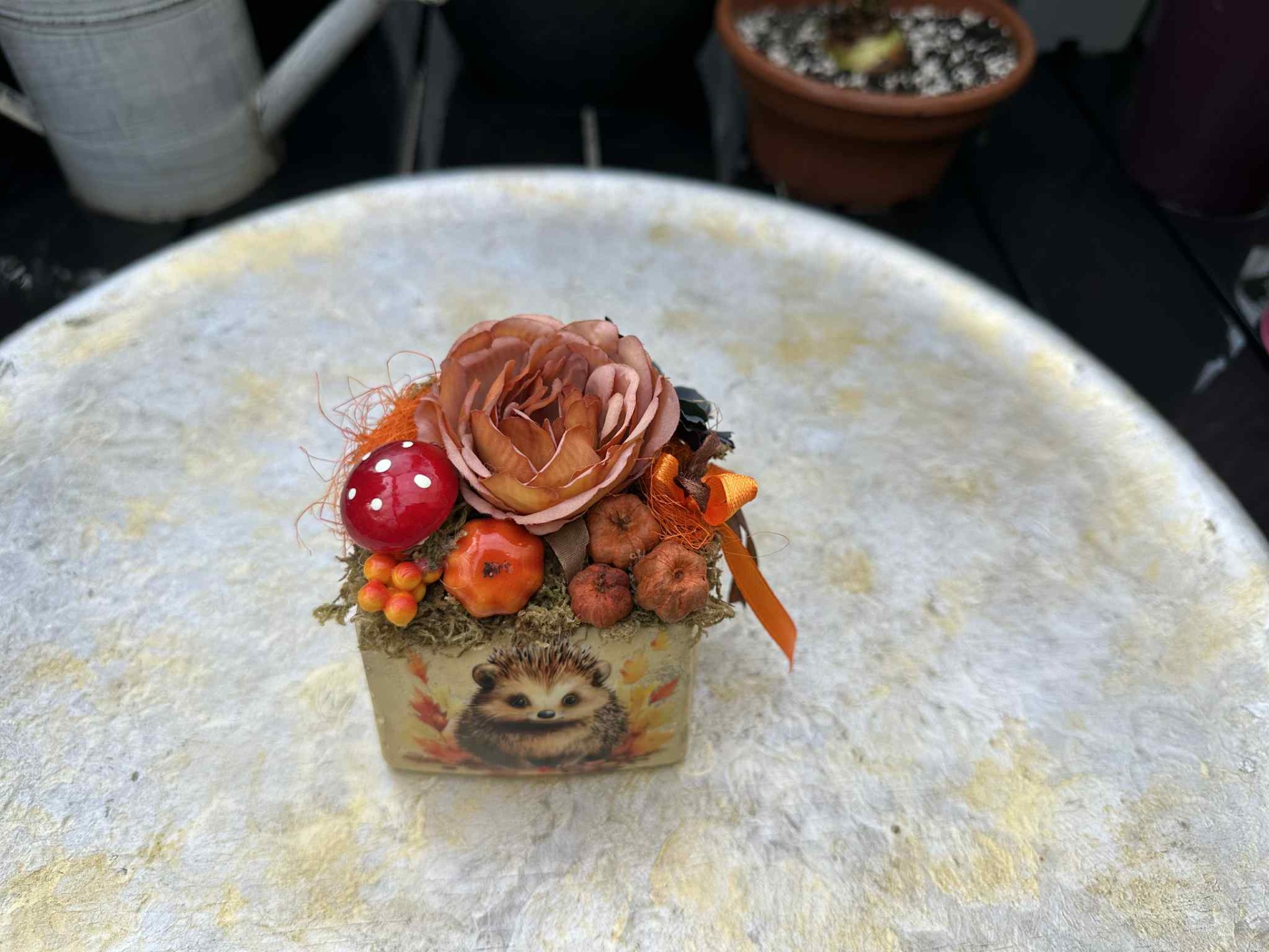 Őszi, fagyálló, sünis kaspó, szárazanyag dekorációval.