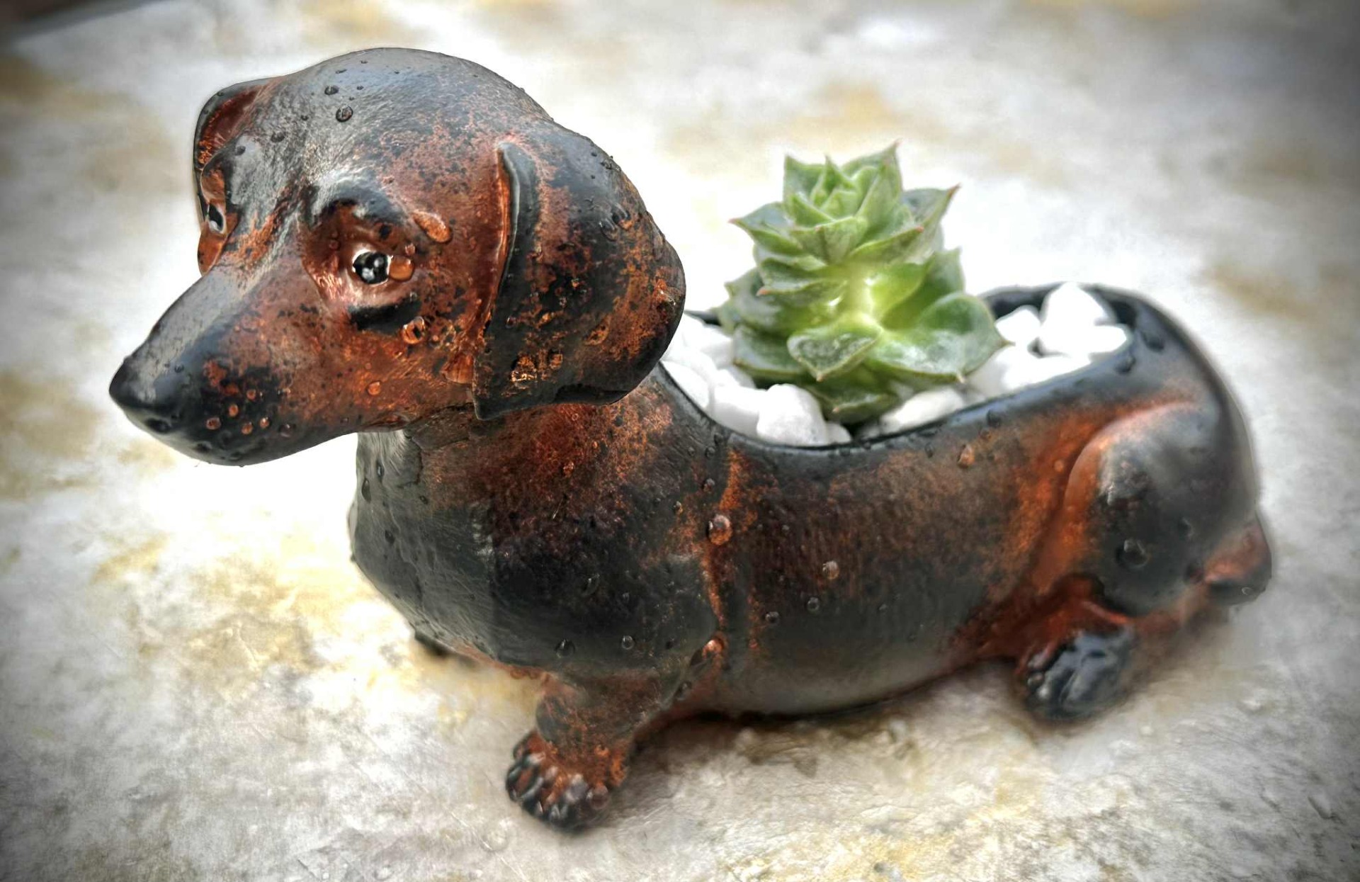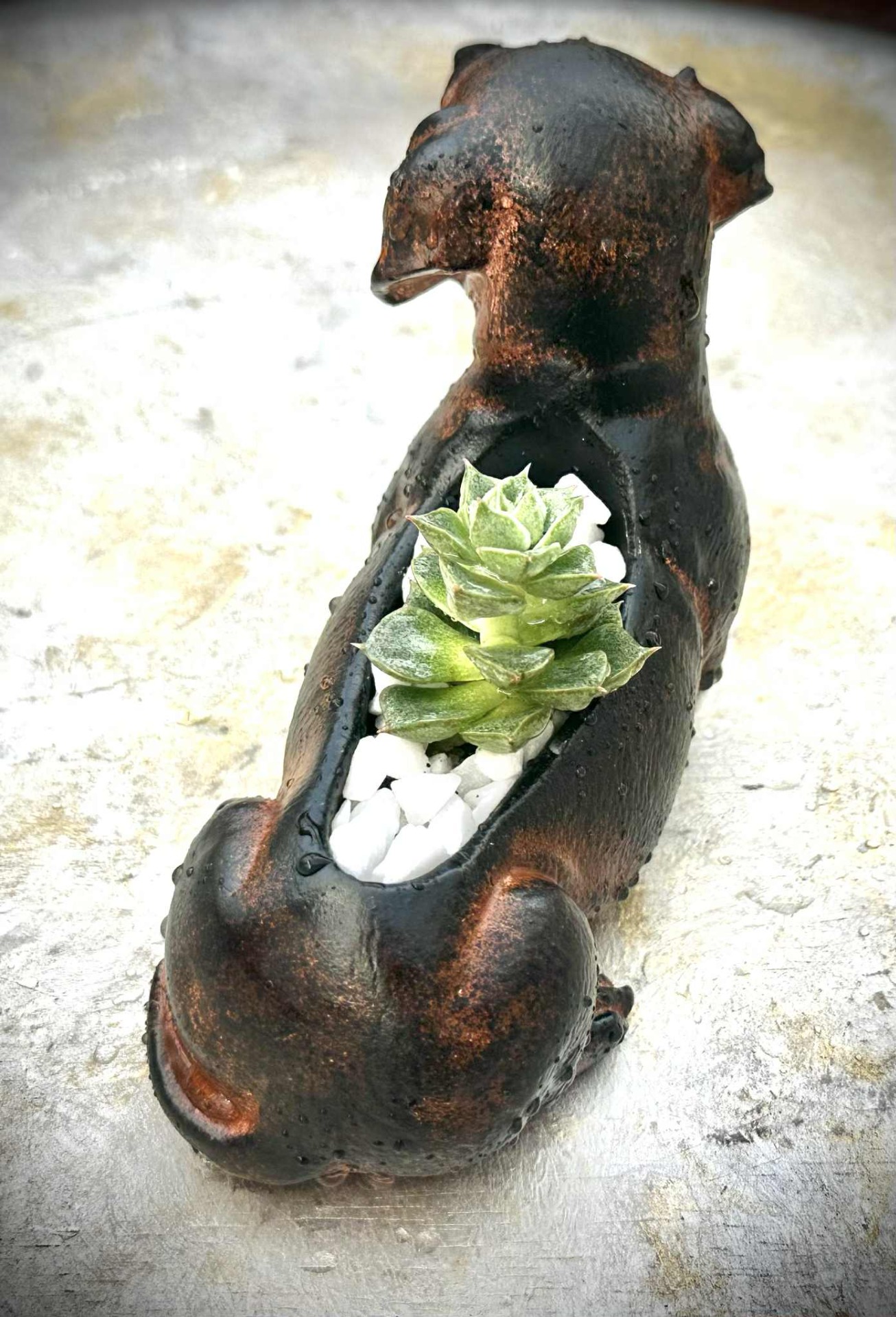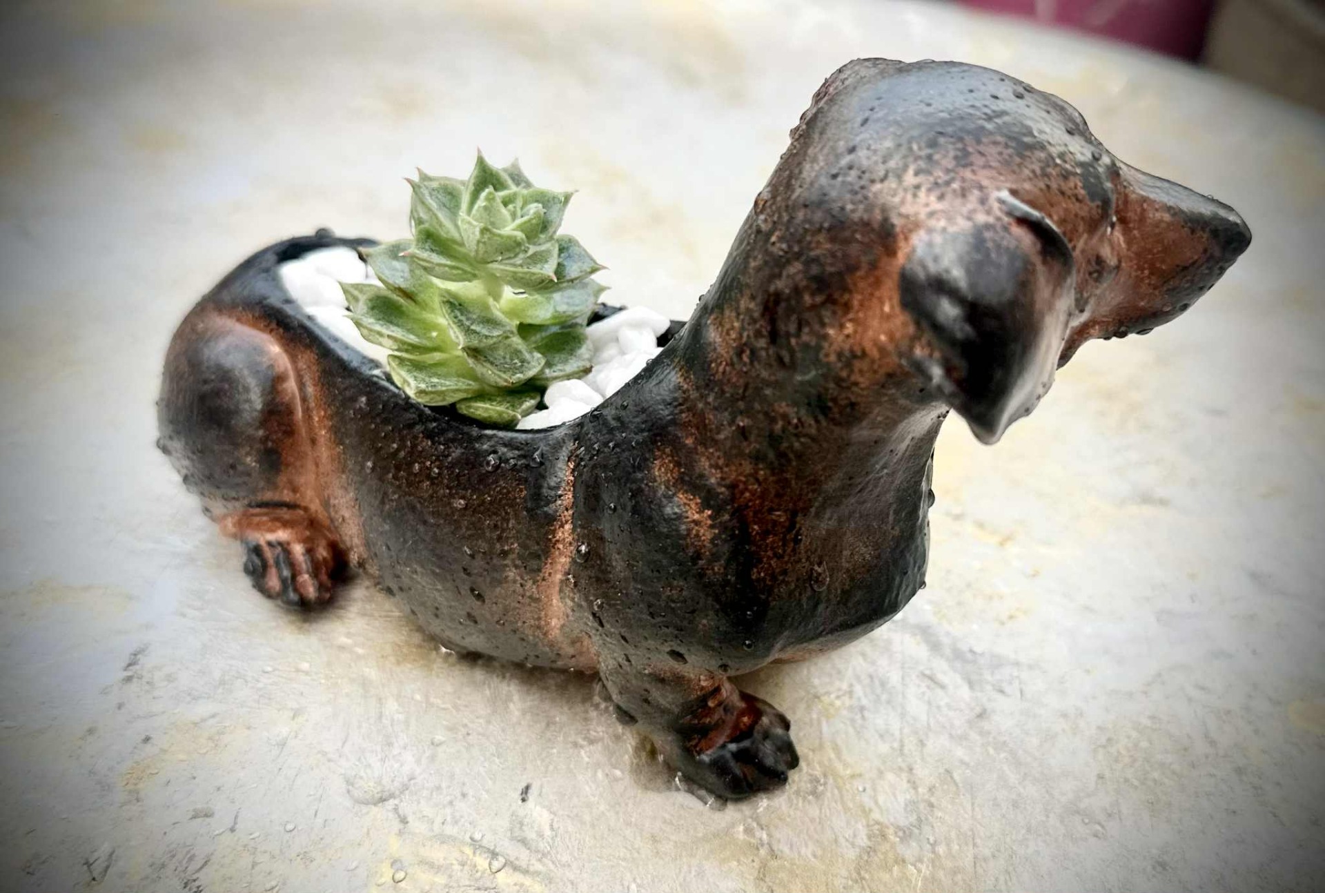 Fagyálló tacskó kaspó, élő pozsgással, fehér dekorkővel megszórva, barna, fekete, fehér, zöld színösszeállítással.