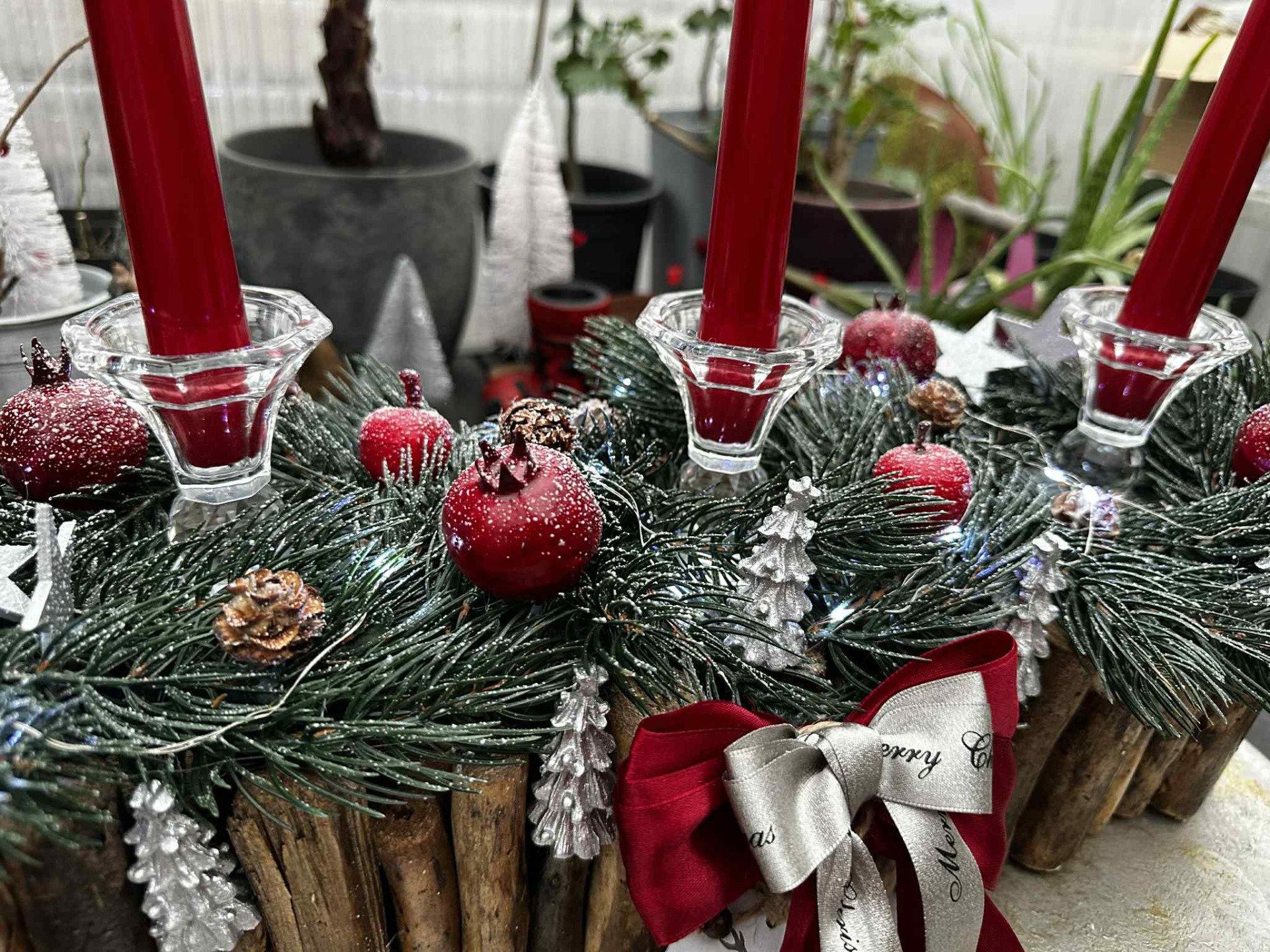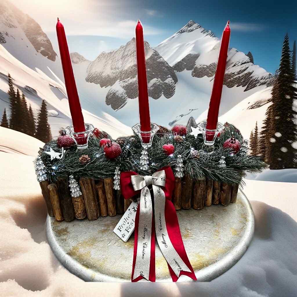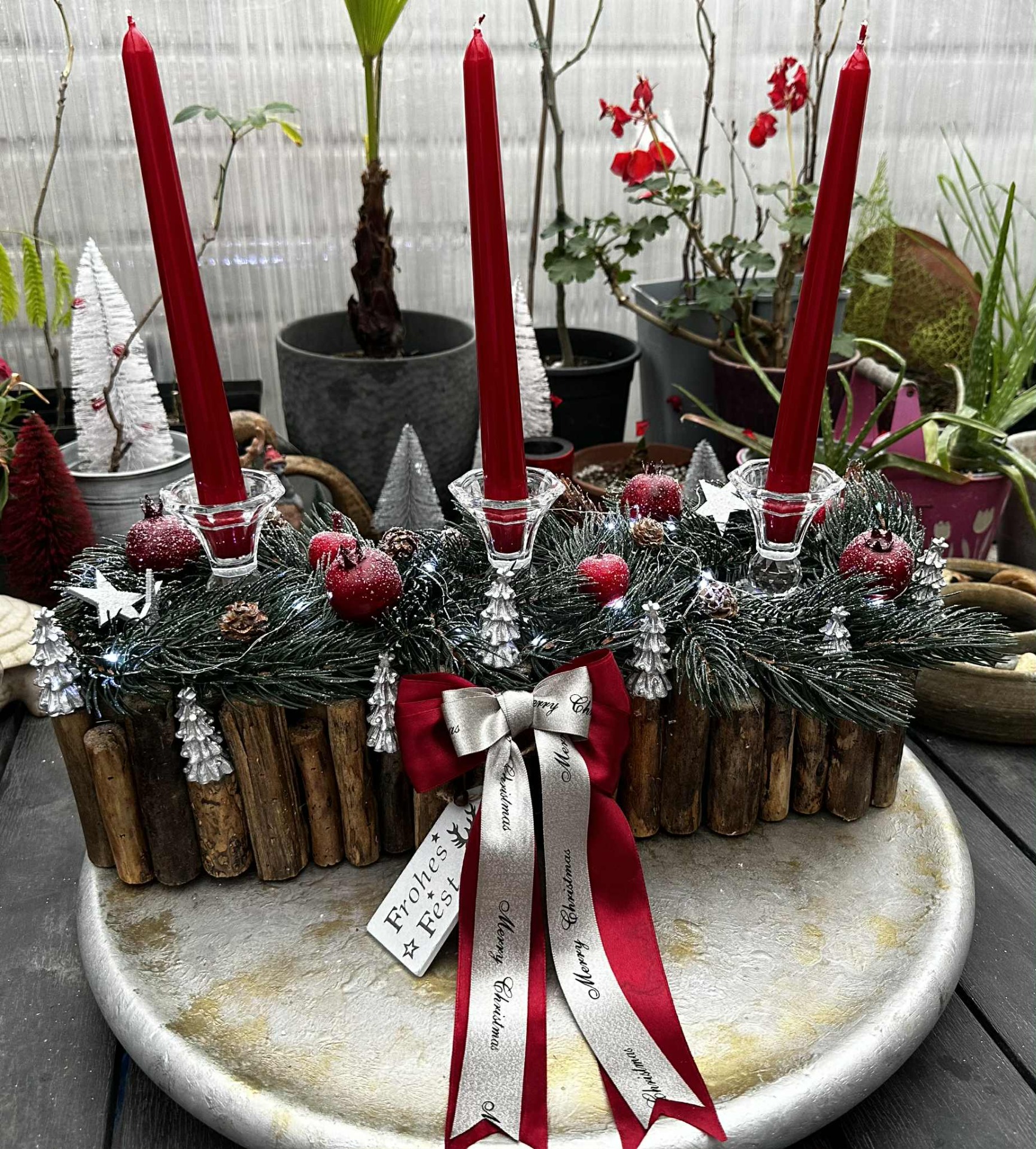 Téli asztaldekoráció, vastag, masszív faágakból összeállított talpazaton, hidegfehér színű világítással, bordó (piros), barna, ezüst színösszeállítás.