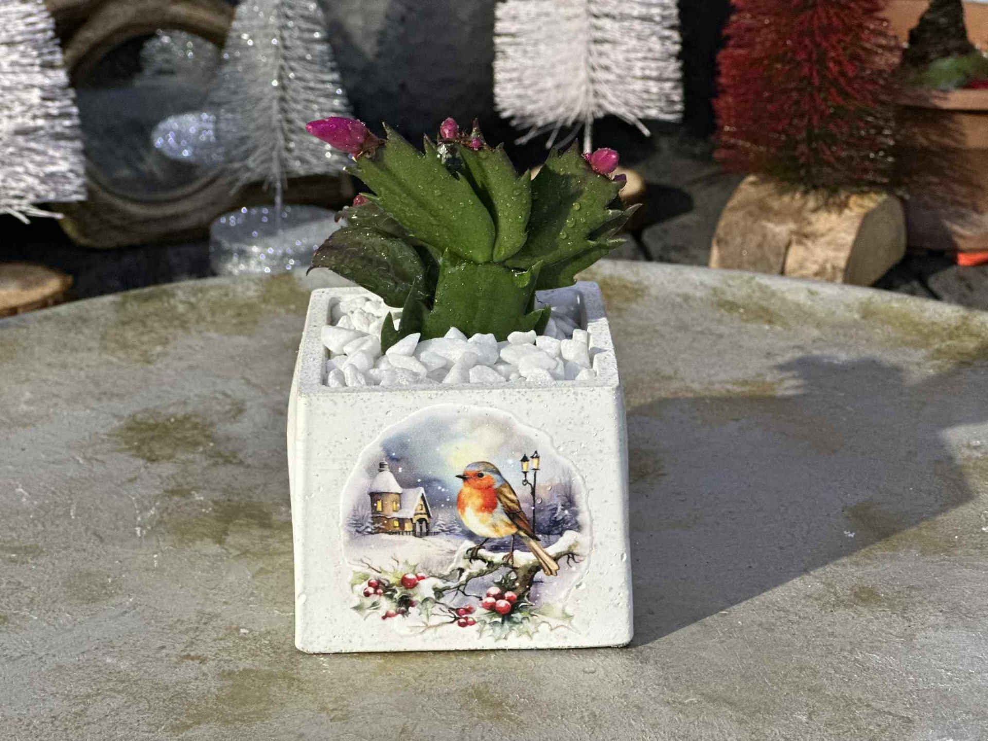 Téli hangulatú, saját szaporítású 3 tő karácsonyi kaktusz beültetés, fehér dekorkővel díszítve, fagyálló kaspóban.