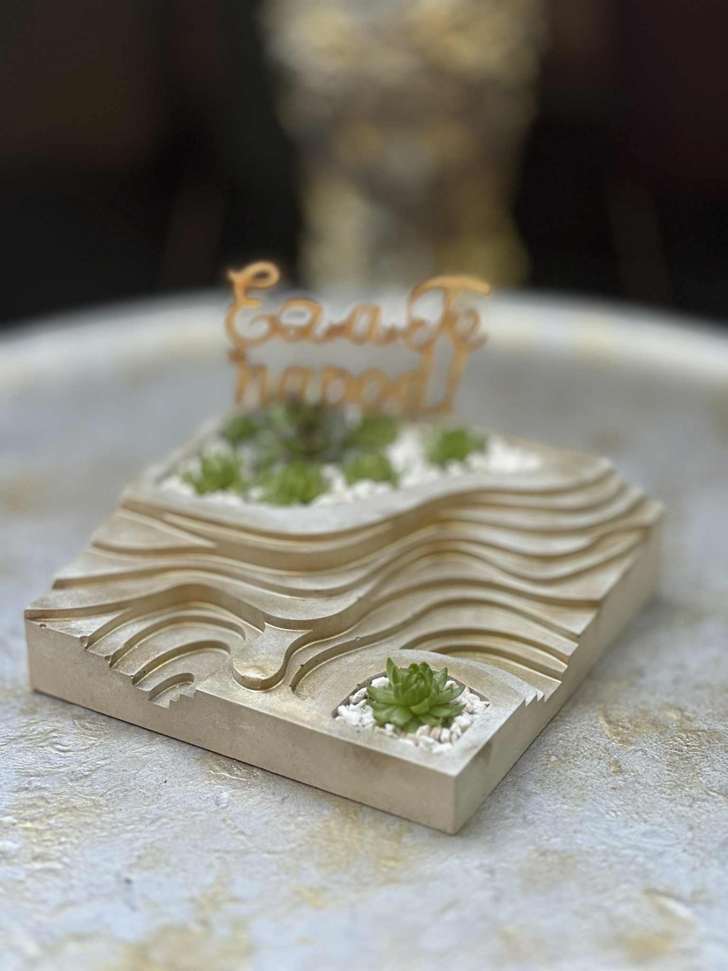 Teraszos virágkaspó, élő pozsgással beültetve, dekorkővel megszórva, "Ez a Te napod!" fatábla felirattal, arany, ezüst színösszeállítással.