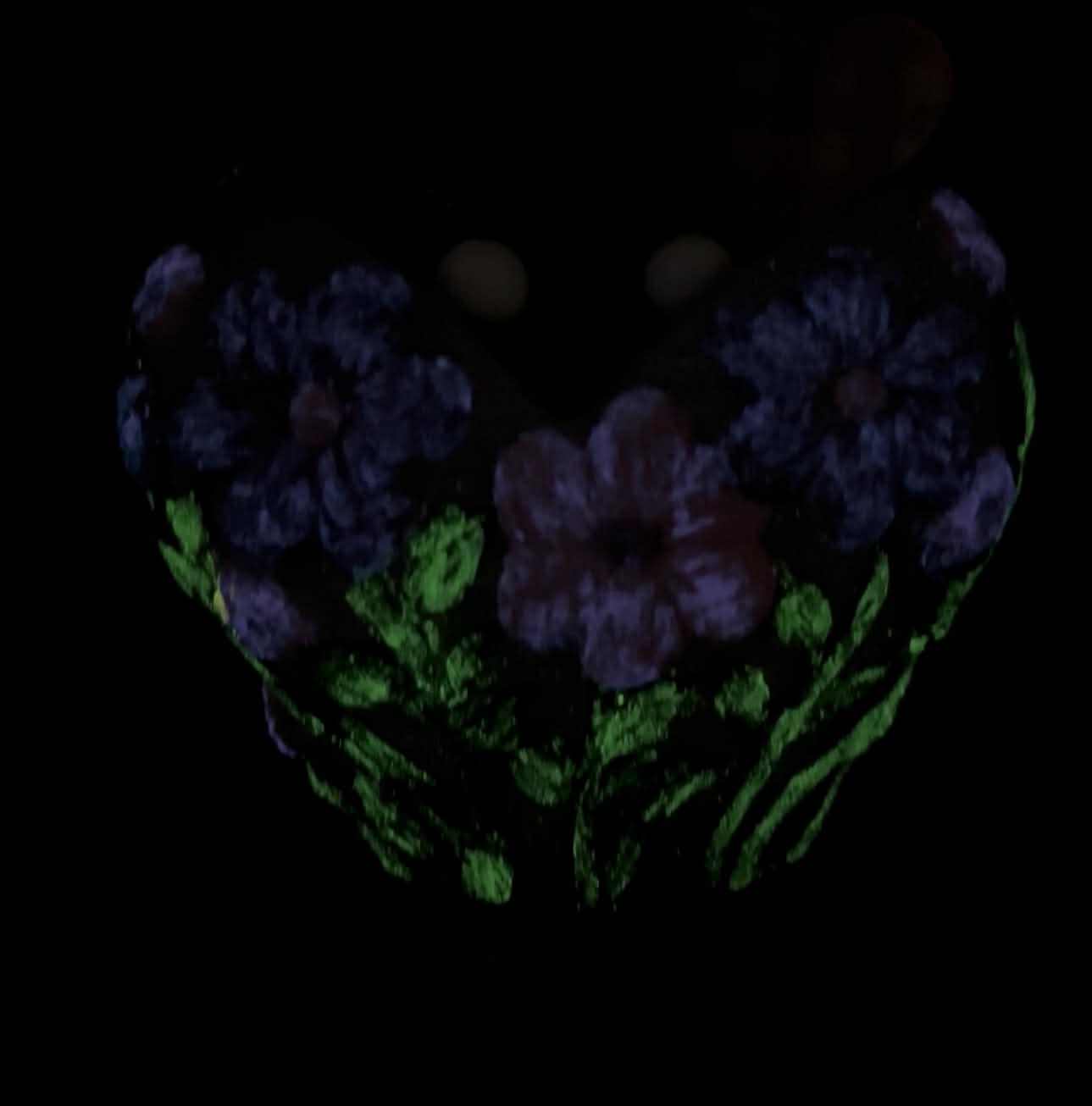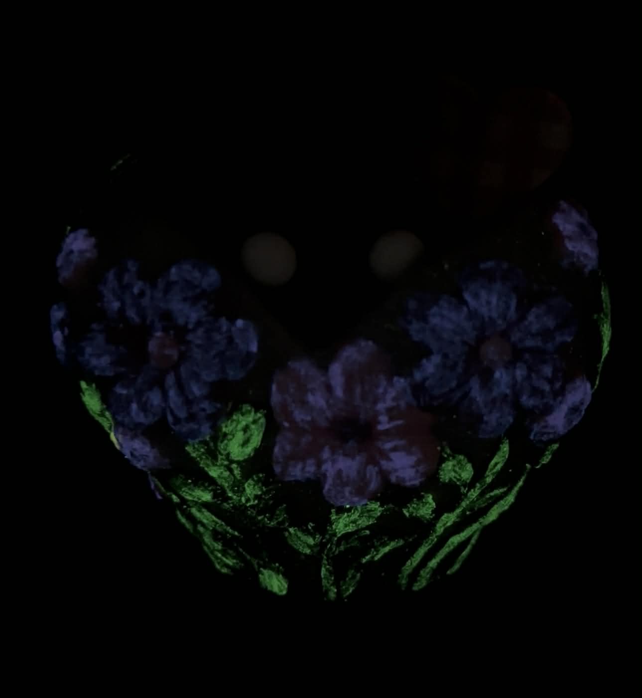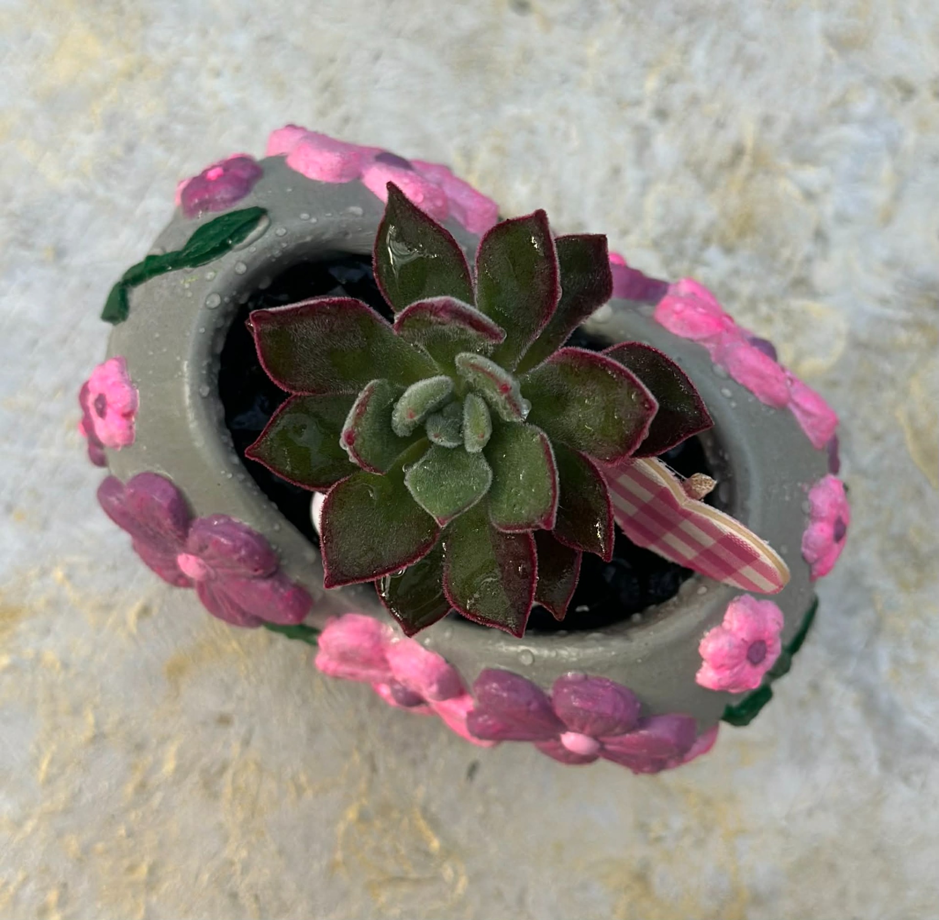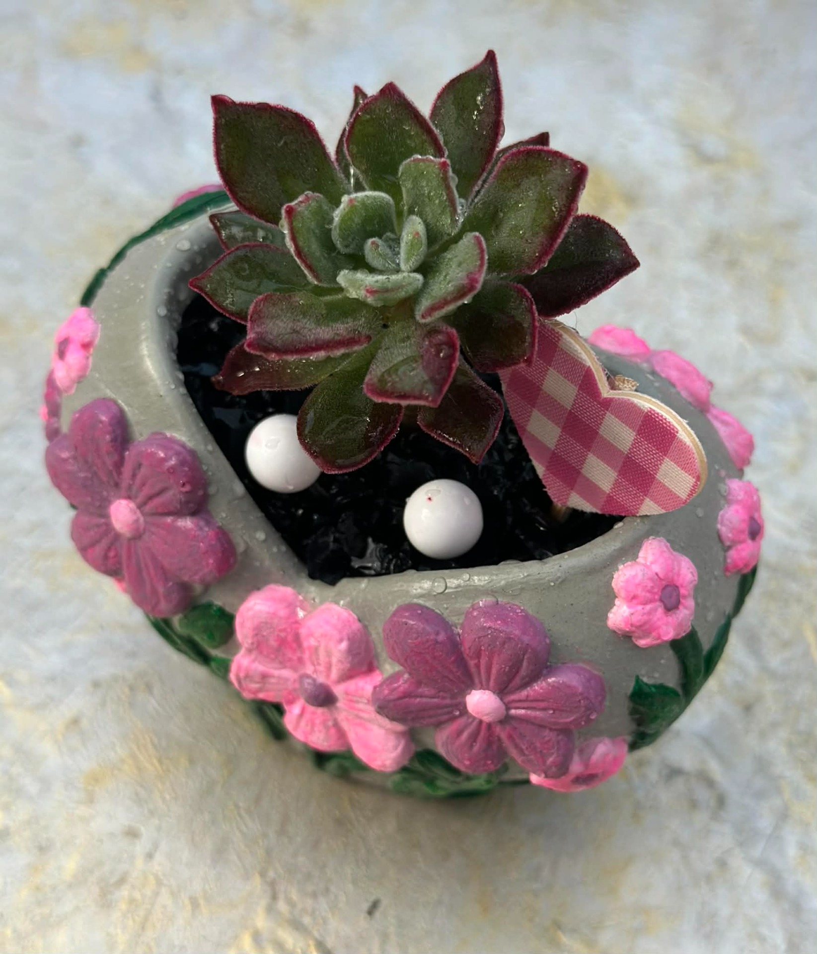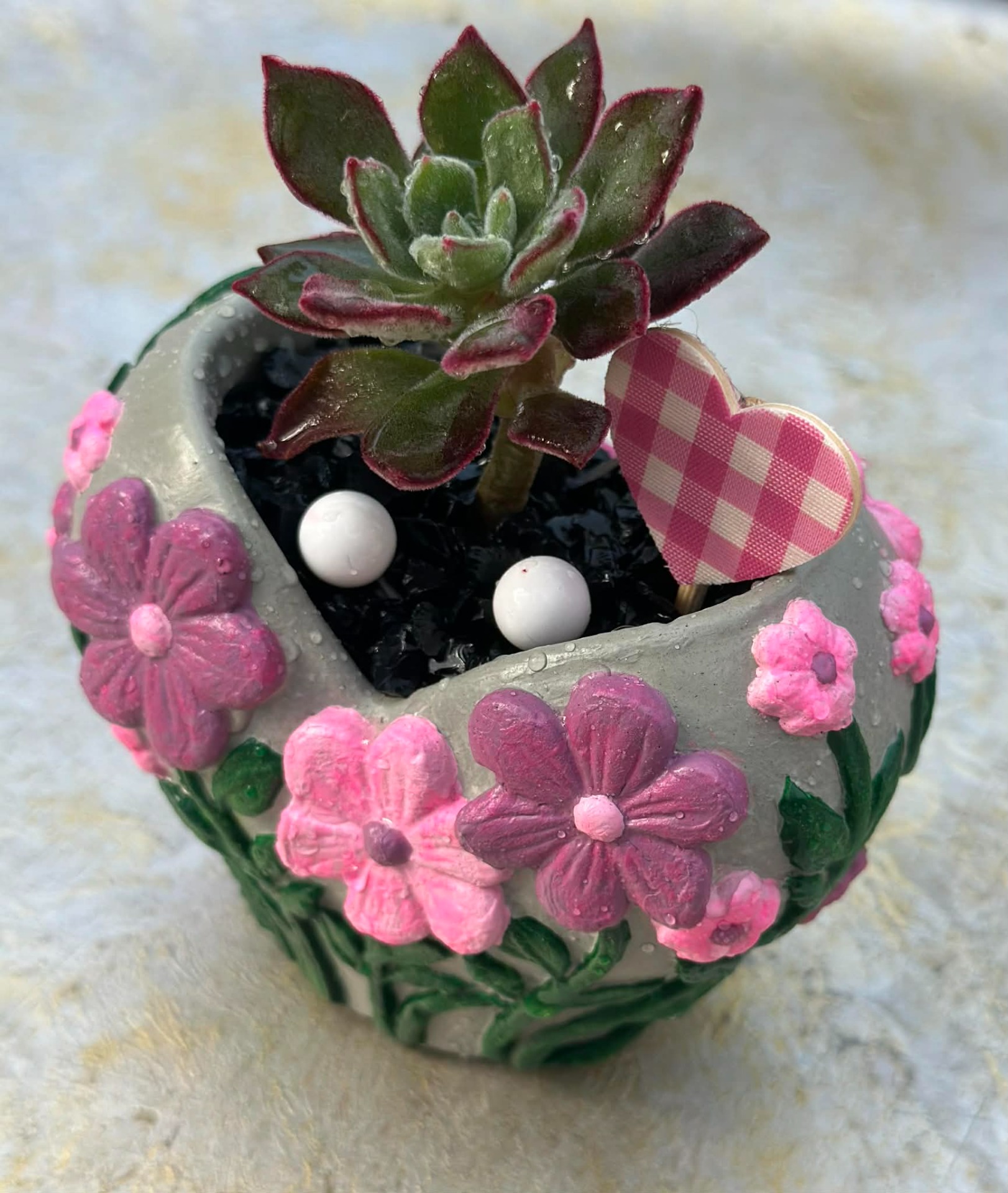 A kaspó sötétben világít és rózsaszín, lila, zöld és szürke színösszeállítással készült. Élő pozsgással van beültetve, pár dekorációval díszítve, fekete dekorkővel megszórva.